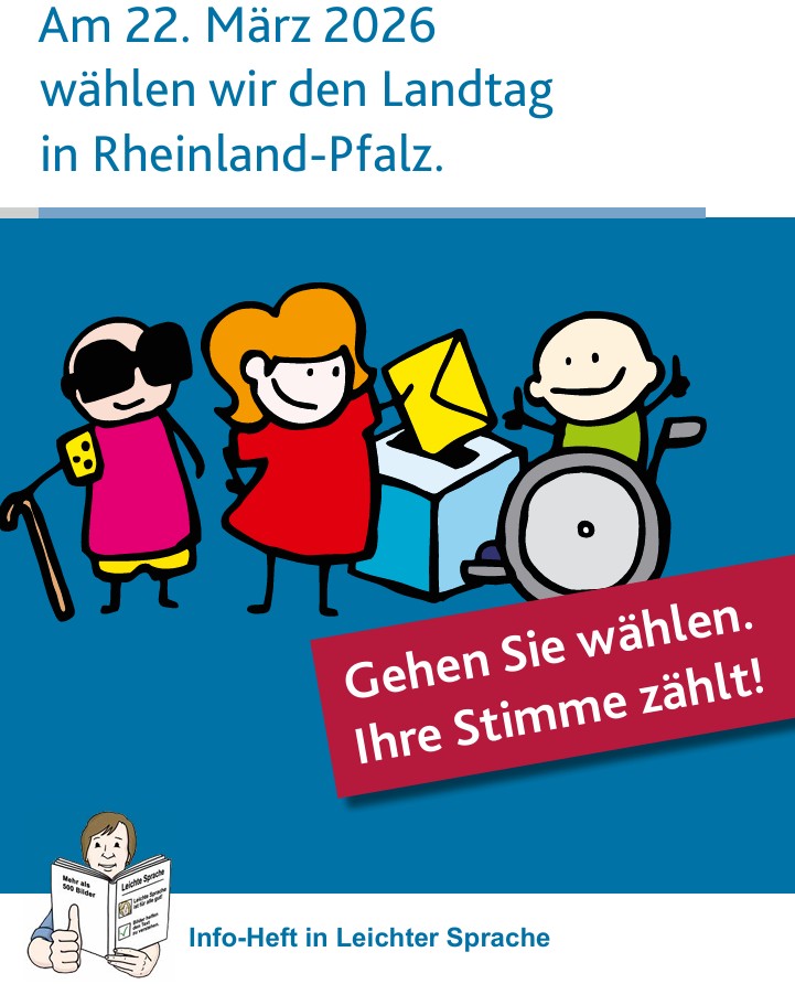 Am 22. März 2026 sind Landtagswahlen in Rheinland-Pfalz. Rund 3,2 Millionen Rheinland-Pfälzerinnen und Rheinland-Pfälzer sind wahlberechtigt,davon sind 310.000 Menschen mit Behinderungen. Unter Federführung der Landeszentrale für politische Bildung in Zusammenarbeit mit dem Sozialministerium gibt es eine neue Broschüre in Leichter Sprache zur anstehenden Landtagswahl.
